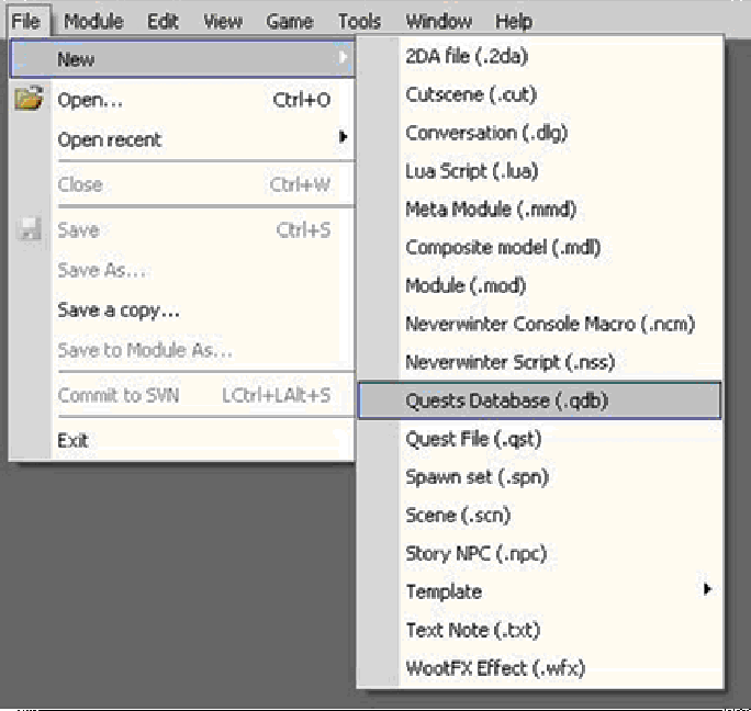 Добавить новое задание (Add New Quest To). Добавляет новое задание в базу данных. Этот пункт аналогичен выбору Создать ‐> Файл задания (.qst) (New ‐> Quest File (.qst)) в меню Файл (File). Единственно отличие заключается в том, что в данном случае вы должны сразу задать имя файла и каталог, в котором вы хотите его сохранить.