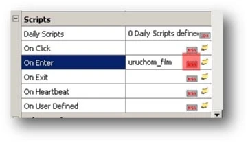 Это означает, что триггер включен. Теперь перейдем к разделу Скрипты (Scripts). Здесь вы увидите параметр При входе (On Enter). Скрипт, присвоенный этому параметру, будет запущен, когда персонаж (Геральт или NPC) зайдет в область триггера. Именно этому параметру необходимо присвоить скрипт, запускающий ролик. Так как начальная точка находится на территории триггера, ролик будет воспроизведен непосредственно после запуска модуля. Это произойдет потому, что Геральт попадет в область триггера.