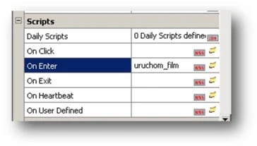 А теперь я расскажу, как запустить редактор скриптов без использования меню Файл (File). В значении параметра укажите имя файла zapusk_film (uruchom_film). Для этого щелкните по правой ячейке параметра При входе (On Enter), введите текст и нажмите клавишу Enter.
