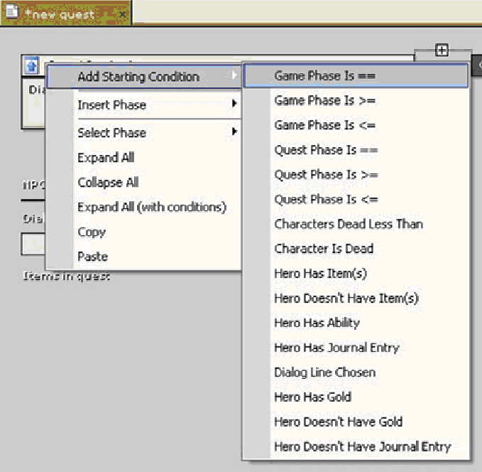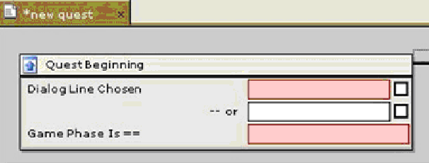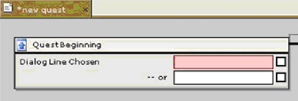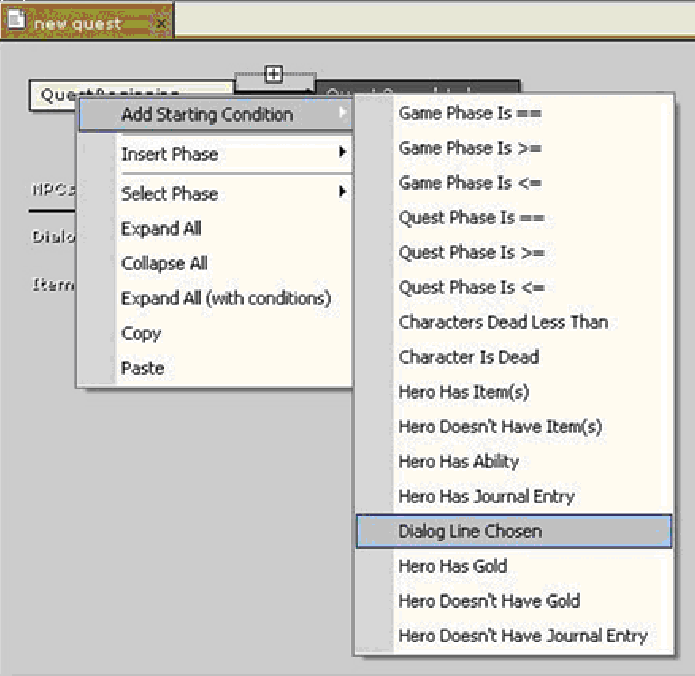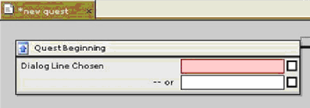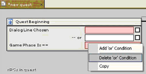 Если бы в диалоге было две или более реплик, начинающих квест, мы могли бы добавить другое условие. Для этого выберите созданное условие в блоке Начало квеста (Quest Beginning) и щелкните по нему правой кнопкой мыши.