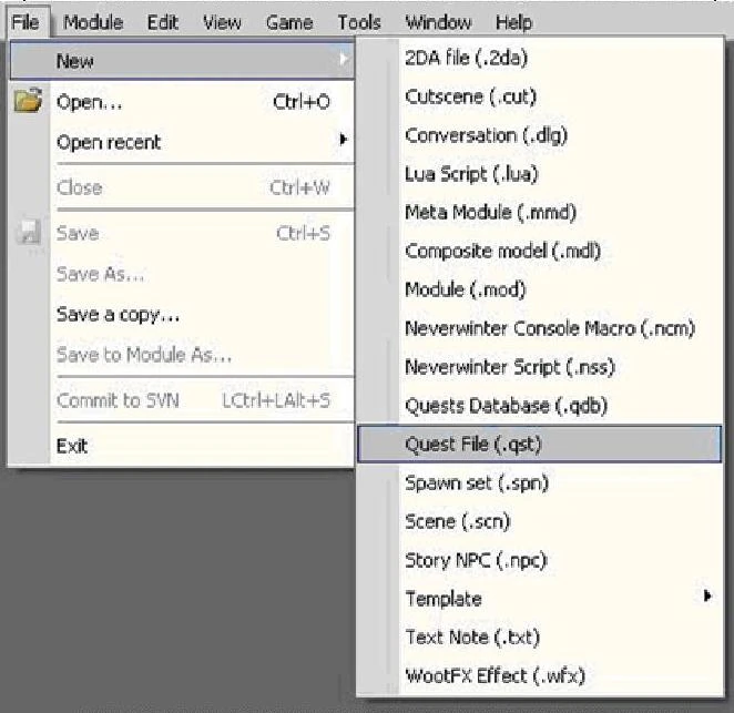 Мы создадим относительно простой квест. Его целью будет убийство главаря разбойников, но при этом оно будет включать в себя три стадии. Это начало квеста (стадия, начинающая квест), исполнение квеста (стадия, в которой Геральт убивает главаря) и завершение квеста (стадия, в которой квест завершается). Чтобы создать новый квест, в меню Файл (File) выберите Создать ‐> Файл квеста (.qst) (New ‐> Quest File (.qst)).