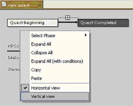 Квест отображается в виде горизонтальной схемы. Однако вы можете поменять вид на вертикальную схему. Для этого щелкните правой кнопкой мыши в окне Новый квест (new quest) и в меню выберите пункт Вертикальный вид (Vertical view).