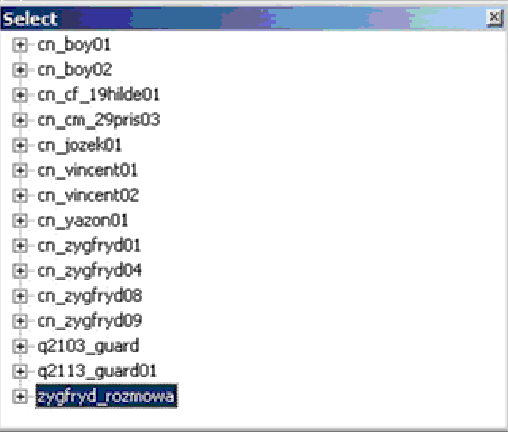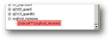 В этом окне перечислены все реплики квестов в каталоге Data\Dialogues, которым присвоен идентификатор задания. Реплики отображаются в виде древоводиной схемы. Наш диалог dialog_zygfryda (zygfrid_rozmowa) также находится в списке. Чтобы выбрать нужную реплику, раскройте ветвь dialog_zygfrida, щелкнув по знаку плюса рядом с именем диалога.