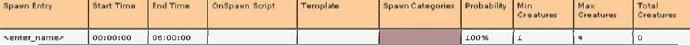 - Интервал появления (Spawn Interval). В этом столбце указывается период времени, который должен пройти между появлениями персонажа. Этот параметр особенно полезен, если один и тот же пункт появления используется для нескольких персонажей.