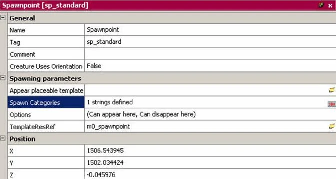 Категории появления (Spawn Categories). Набор признаков, описывающих область, в которой появляется персонаж. Значение должно быть идентично одной из категорий в описании пункта появления персонажа.