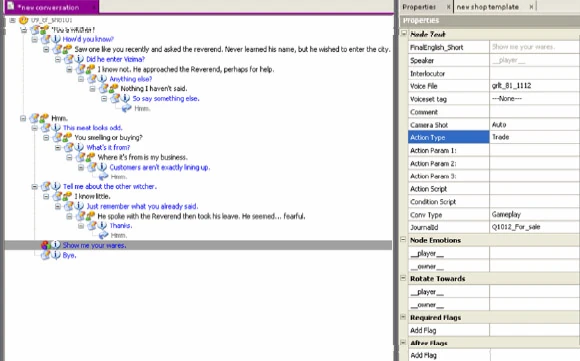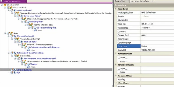 Щелкните левой кнопкой мыши по реплике, отвечающей за кузницу (в примере эта реплика выделена серым цветом). Перейдите в окно свойств в правой части экрана. Параметру Тип диалога (Conv Type, выделен синим цветом) присвойте значение Gameplay.