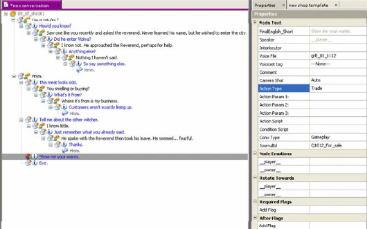 Щелкните левой кнопкой мыши по реплике, отвечающей за хранилище (в примере эта реплика выделена серым цветом). Перейдите в окно свойств в правой части экрана. Параметру Тип диалога (Conv Type, выделен синим цветом) присвойте значение Gameplay.