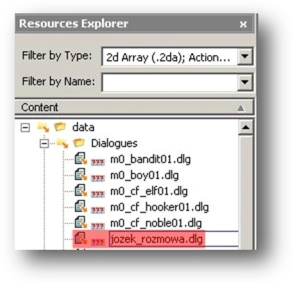 Теперь необходимо добавить возможность выбора хранилища при разговоре Геральта с Юзом. Для этого мы снова воспользуемся окном обзора ресурсов (Resources Explorer). Выберите Data ‐> Dialogues и дважды щелкните по файлу dialog_yuza.dlg (jozek_rozmowa.dlg).