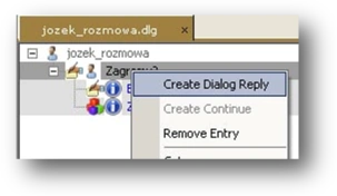 Выберите реплику "Сыграем?" (Zagramy?) и щелкните по ней правой кнопкой мыши. В меню выберите пункт Создать стандартный ответ (Create Dialog Reply).