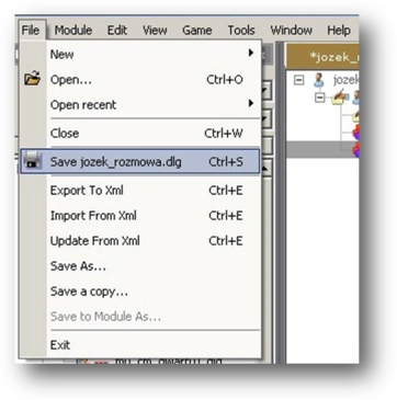 Теперь осталось только сохранить диалог с Юзом. Для этого в меню Файл (File) выберите пункт Сохранить dialog_yuza.dlg (Save jozek_rozmowa.dlg).