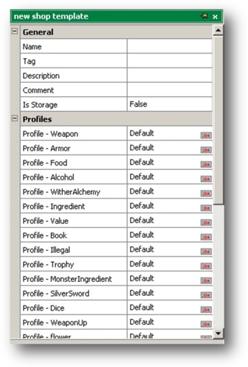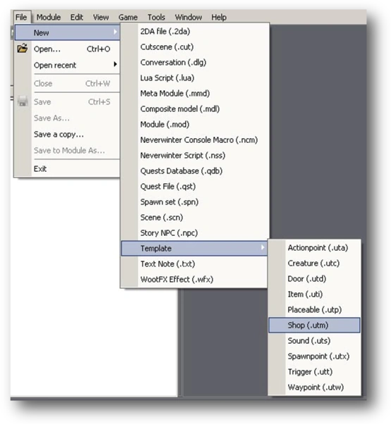 Здесь мы рассмотрим второй тип. Допустим, Юз способен брать на хранение вещи Геральта. Создание хранилища основано на создании магазина. Начнем с создания шаблона магазина. Для этого в меню Файл выберите Создать ‐> Шаблон ‐> Магазин (.utm) (New ‐> Template ‐> Shop (.utm)).