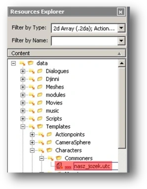 В окне обзора ресурсов (Resources Explorer) выберите Data ‐> Templates ‐> Character ‐> Commoners. Дважды щелкните по файлу nash_yuz.utc (nasz_jozek.utc).