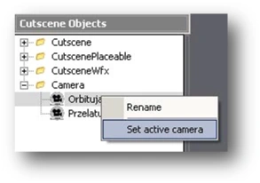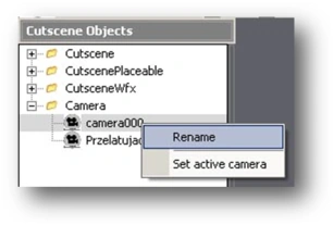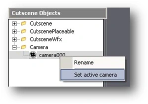 Naturally, camera000 has to be selected in the Cutscene Objects window. Next, right-click the camera in the Cutscene Objects window and select Set active camera from the menu: