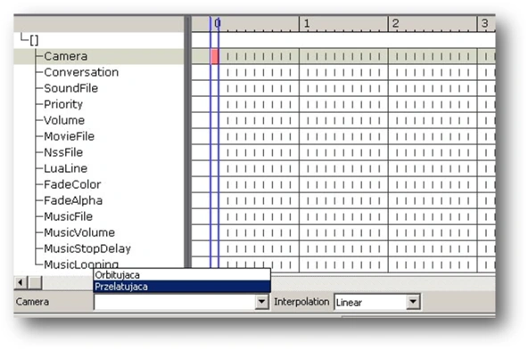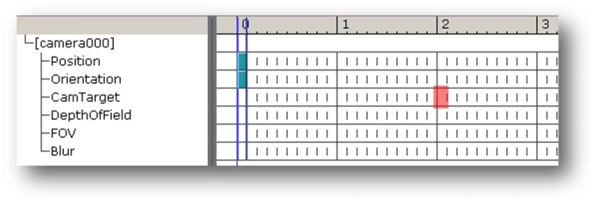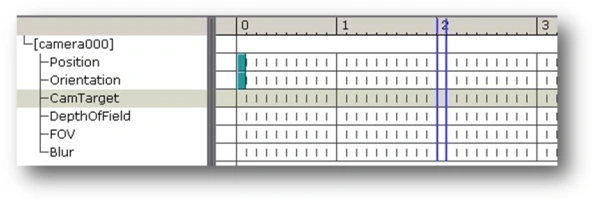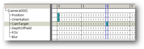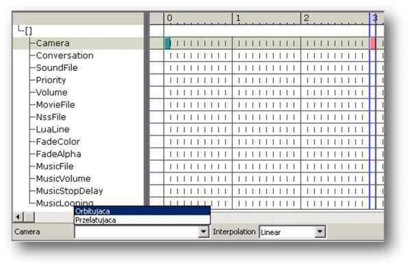 The numbers – 0, 1, 2, 3, etc. – represent the subsequent seconds of the cutscene. Each of the 10 vertical notches in a second signifies 0.1 of a second. To move the time marker, just click elsewhere on the timescale. The small light-blue squares depict keys: