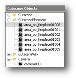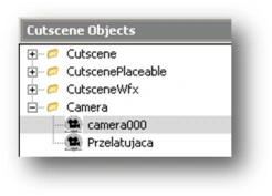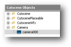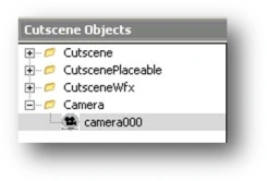 The camera has also been added in the Cutscene Objects window. A new tree has now appeared called Camera. Clicking it and it will expand and display the object camera000: