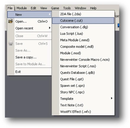 - To create a cutscene, first choose New-> Cutscene (.cut) from the File menu: