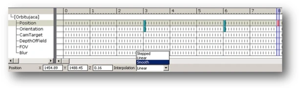 First, change the interpolation of the camera movement. Click the Orbiting camera in the Cutscene Objects window and select the first key on the Position path. The key will turn red to indicate that it’s active. Then change the Interpolation option of the camera to Smooth at the bottom of the window: