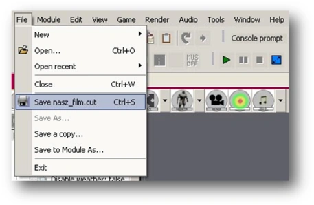 The effect of our work can be seen in the Area Editor. All that’s left is to save the cutscene. To do this, choose Save our_film.cut from the File menu: